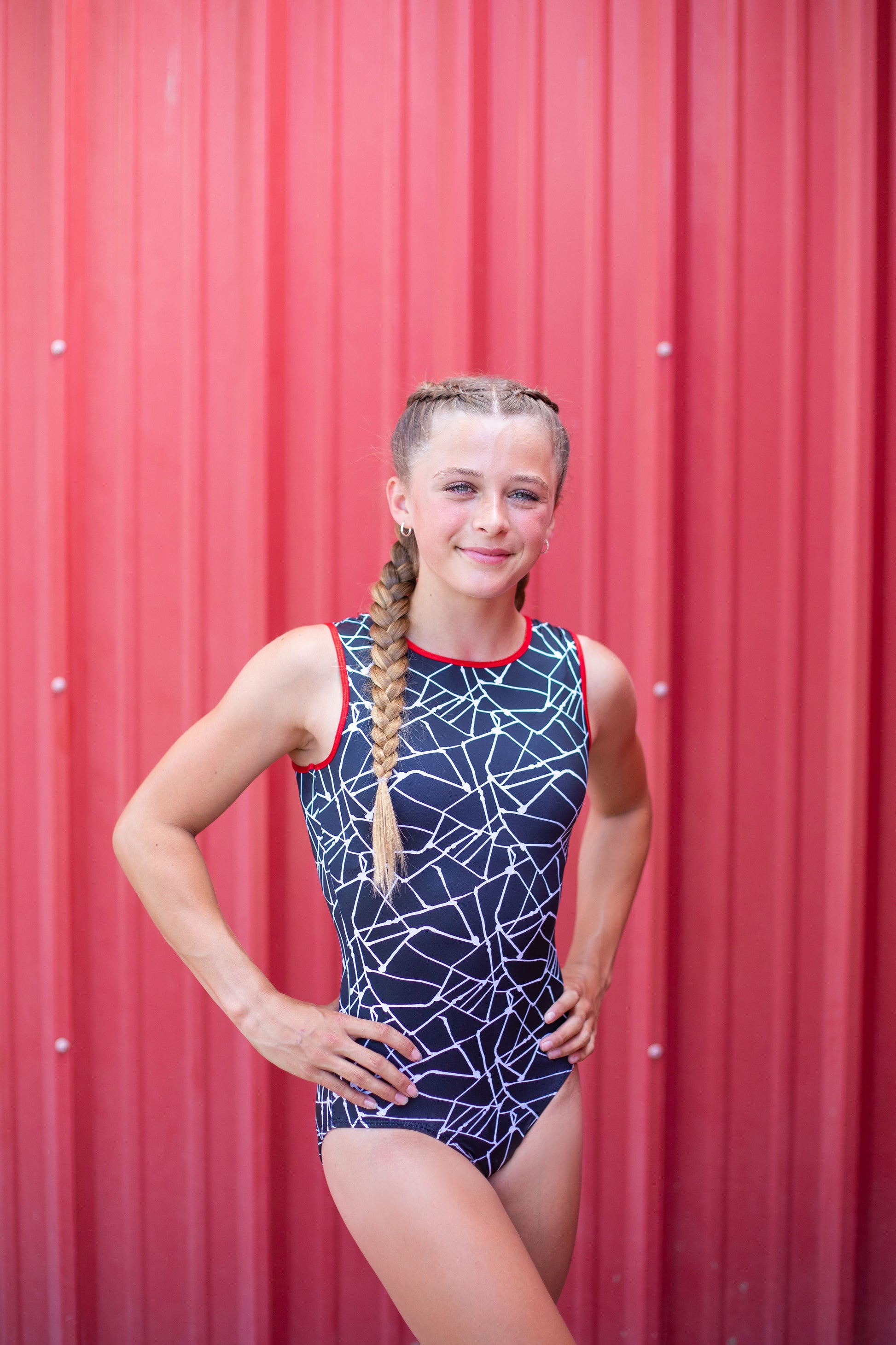 Make a bold statement in our Black Geometric Leotard featuring striking red trim around the neck and arms. Designed for both style and comfort, this leotard moves with you during practice, competition, or dance.